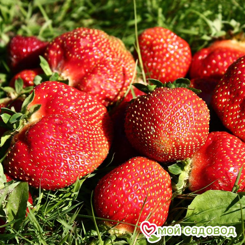 Усеченно-конические ярко-красные ягоды очень крупные (35-75 г). Мякоть при окончательном созревании очень сладкая. Отличная устойчивость к земляничному клещу и другим заболеваниям и вредителям.