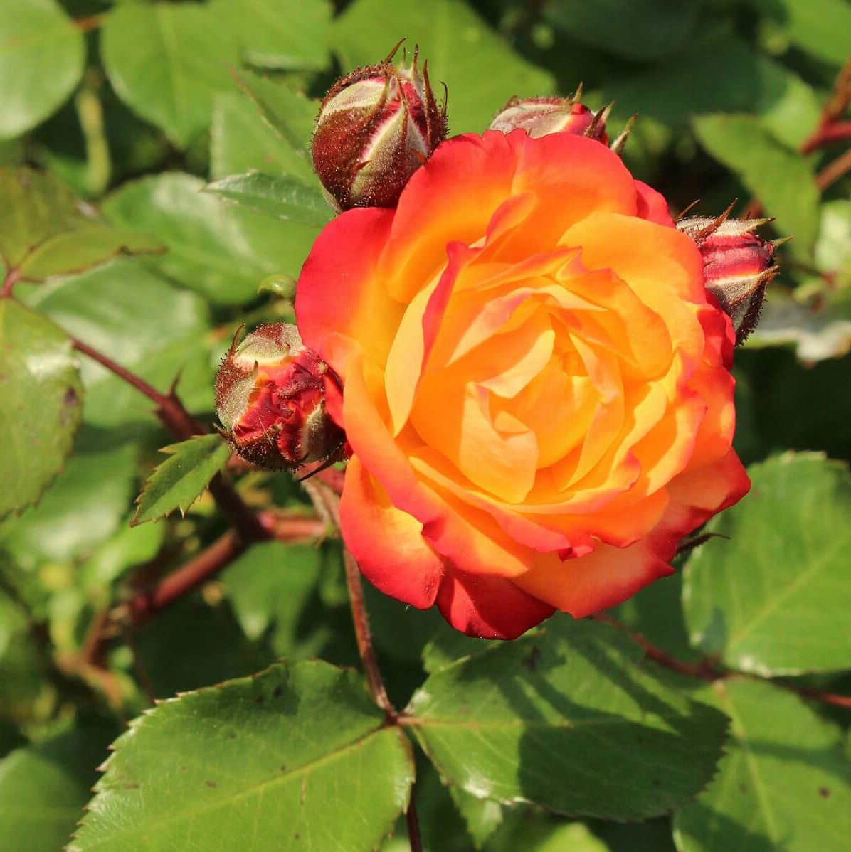 Куст компактный и густой, достигающий в высоту 40-60 см и в ширину 50 см. На крепких побегах формируются среднего размера, насыщенного зеленого цвета листики с глянцевой поверхностью. Облиственность у растения довольно сильная. Однако несмотря на это, в период активного цветения кусты почти полностью покрыты соцветиями, за счет чего практически не видно листву. Желто-оранжевые с малиновыми полосами бутоны имеют овальную, заостренную форму. По мере распускания цветка окрас лепестков становится более желтым с красно-оранжевыми краями. Форма цветка – от чашевидной до розетковидной. Оттенки плавно переходят один в другой. Цветки махровые, диаметром 4-6 см, в каждом от 25 до 45 лепестков. На одном стебле образуется 5-10 цветков, собранных в соцветия, покрывающие весь куст. Сорт обладает слабым ароматом, но очень приятным, с легкими пряными нотками чайного дерева и масла иланг-иланга. Посадка саженцев полиантовых роз соответствует правилам высаживания обычных. С той лишь разницей, что они не такие требовательные к месту посадки и прекрасно растут в полутени. Это даже лучше, чем солнцепек. Им не страшна избыточная влажность, но это не значит, что их надо специально высаживать в подтапливаемых местах, с высоким залеганием грунтовых вод.